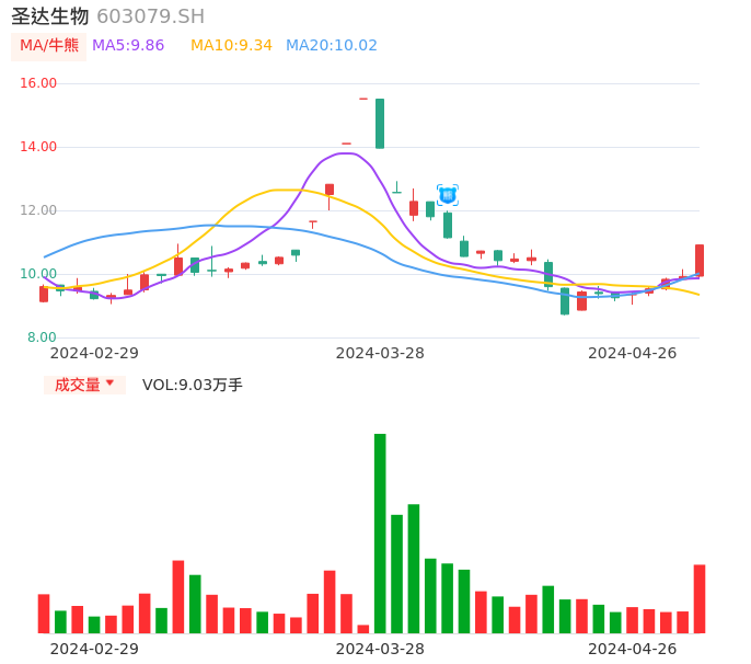 04月26日,圣达生物收报10.91,股价涨幅9.98%,成交金额9463.02万元,换手率5.27%。