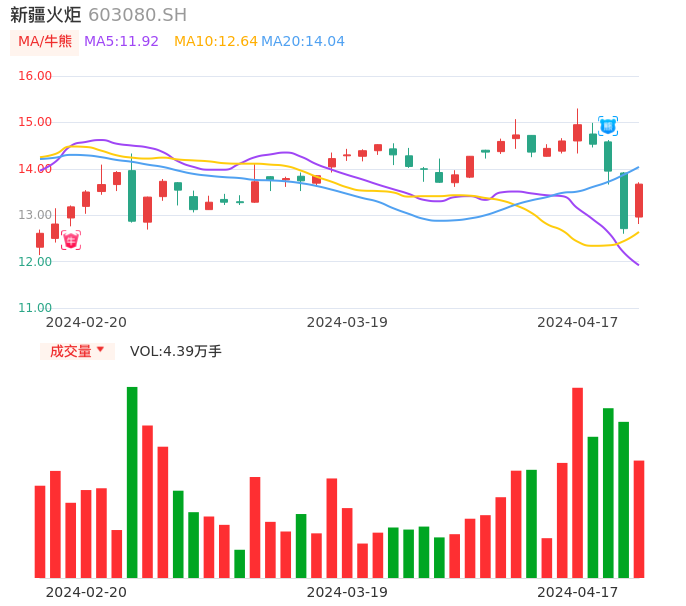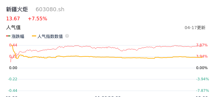 04月17日,新疆火炬收报13.67,股价涨幅7.55%,成交金额5909.98万元,换手率3.10%。