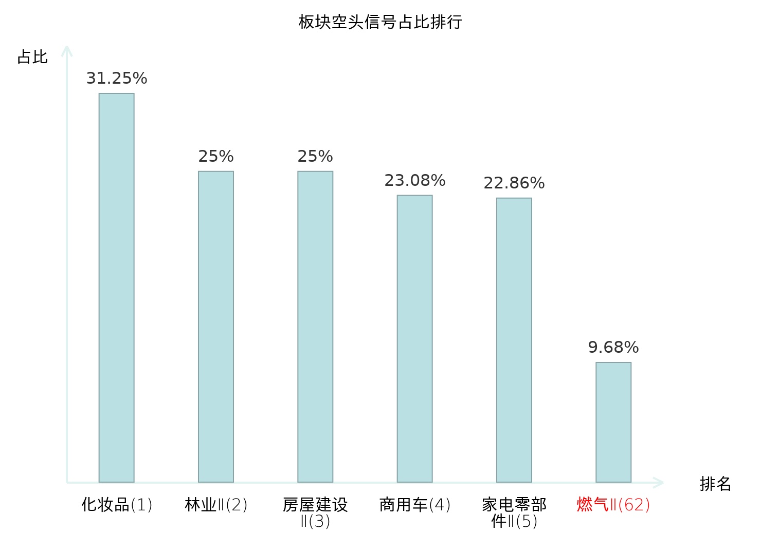 全市场所有行业板块中主力空头信号占比排名中,化妆品板块位居第一。房屋建设Ⅱ板块名次提升最快,较昨日上升113位。