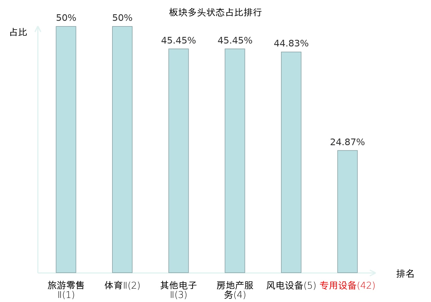 全市场所有行业板块中主力多头状态占比排名中,旅游零售Ⅱ板块位居第一。其他家电Ⅱ板块名次提升最快,较昨日上升112位。