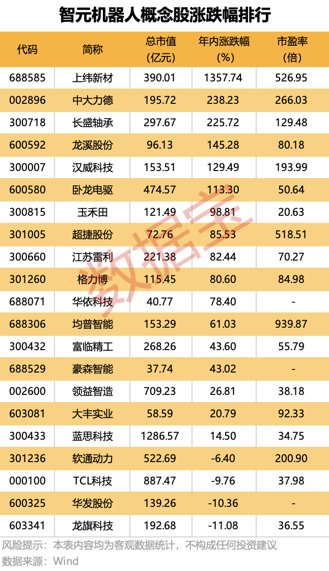 证券时报·数据宝根据公开渠道不完全统计,智元机器人概念股除了近期暴涨的上纬新材和玉禾田外,还有多家上市公司与智元机器人有合作甚至参股。
