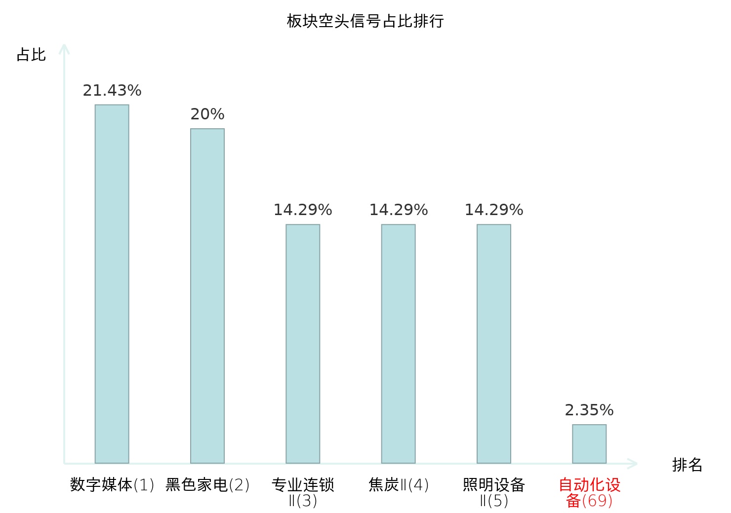 全市场所有行业板块中主力空头信号占比排名中,数字媒体板块位居第一。装修装饰Ⅱ板块名次提升最快,较昨日上升110位。