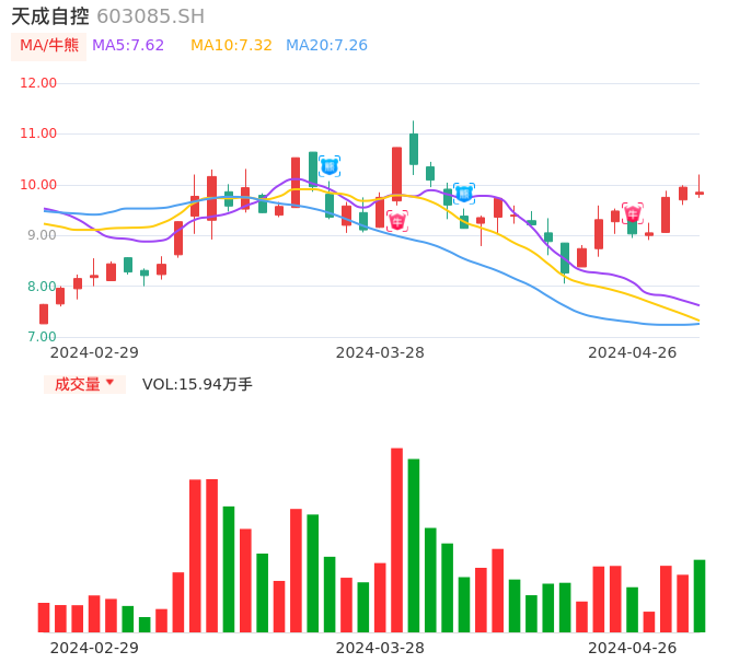 04月26日,天成自控收报9.85,股价涨幅-1.01%,成交金额1.59亿元,换手率4.31%。