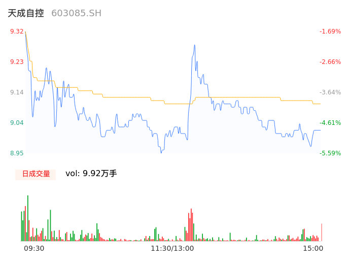 04月22日,天成自控收报9.03,股价涨幅-4.75%,成交金额9028.26万元,换手率2.68%。