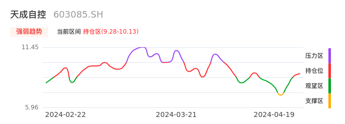 我们来看一下该股的九方特色指标强弱趋势的情况:天成自控近日从观望区上穿到持仓区。股价短期站稳多头区域,上升动能仍较为充足,可积极关注。后续重点关注上方压力位:10.13元是否能突破上攻。