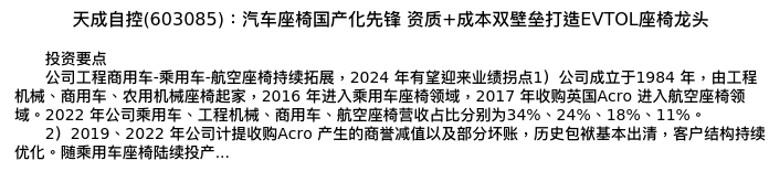 值得注意的是:2024年04月浙商证券的邱世梁/王华君/刘村阳分析师,首次发布关于天成自控的研究报告,标题为:天成自控(603085):汽车座椅国产化先锋 资质+成本双壁垒打造EVTOL座椅龙头。