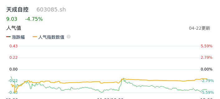 04月22日,天成自控收报9.03,股价涨幅-4.75%,成交金额9028.26万元,换手率2.68%。