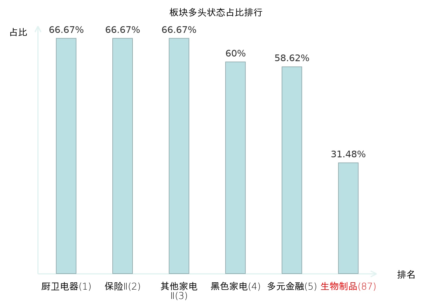 全市场所有行业板块中主力多头状态占比排名中,厨卫电器板块位居第一。其他家电Ⅱ板块名次提升最快,较昨日上升56位。