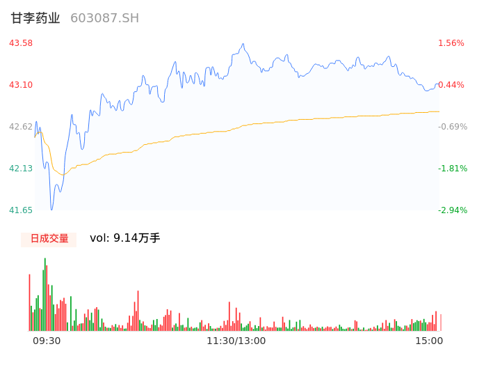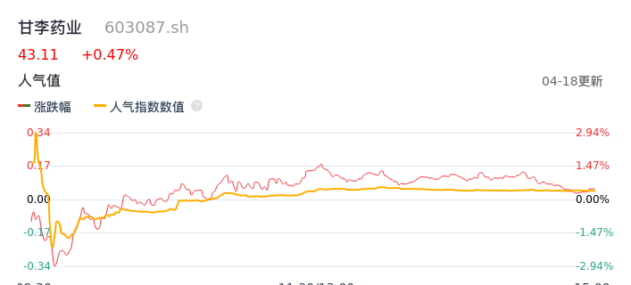 04月18日,甘李药业收报43.11,股价涨幅0.47%,成交金额3.92亿元,换手率1.73%。