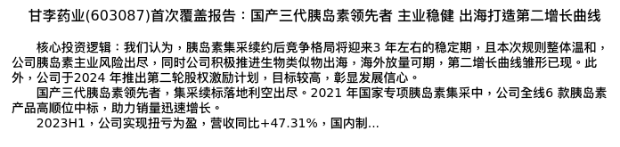 值得注意的是:2024年04月国盛证券的张金洋/胡偌碧/陶宸冉分析师,首次发布关于甘李药业的研究报告,标题为:甘李药业(603087)首次覆盖报告:国产三代胰岛素领先者 主业稳健 出海打造第二增长曲线。