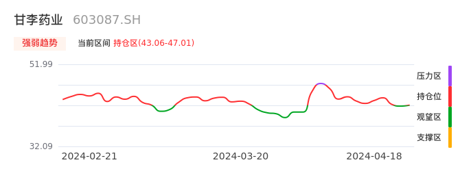 我们来看一下该股的九方特色指标强弱趋势的情况:甘李药业近日从观望区上穿到持仓区。股价短期站稳多头区域,上升动能仍较为充足,可积极关注。后续重点关注上方压力位:47.01元是否能突破上攻。