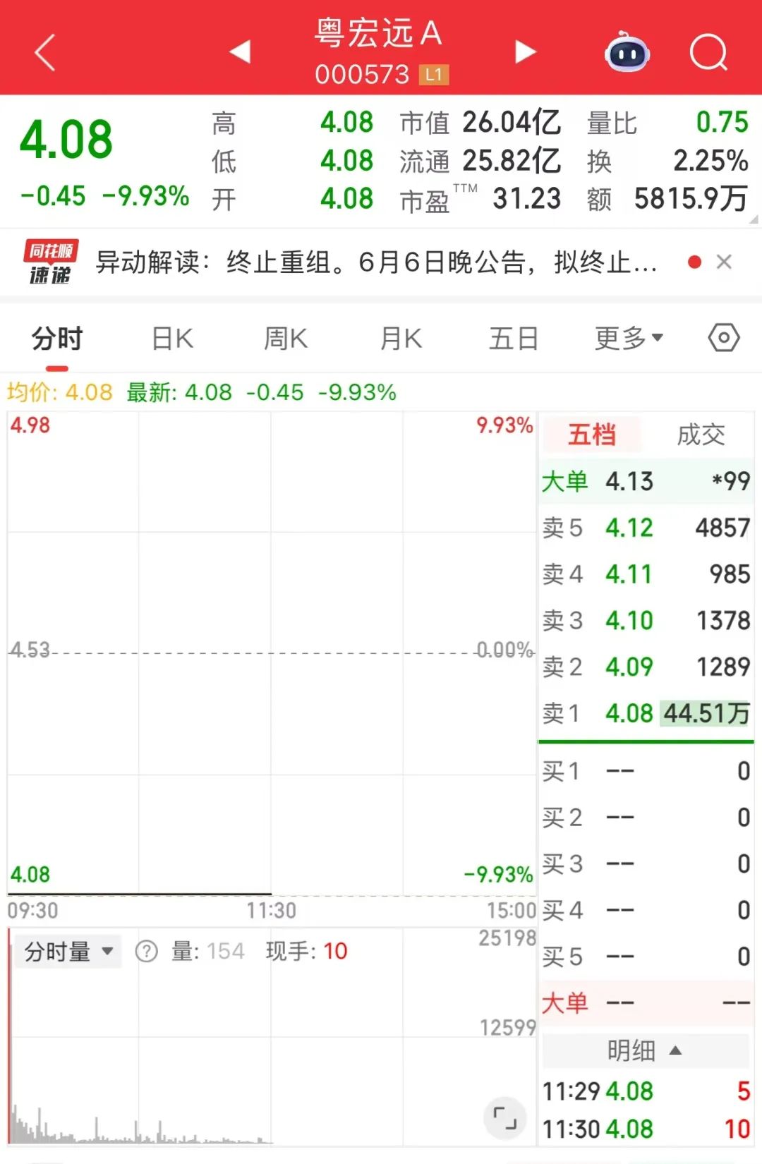 粤宏远A(000573)今日一字板跌停,最新股价报4.08元/股,总市值26亿元。