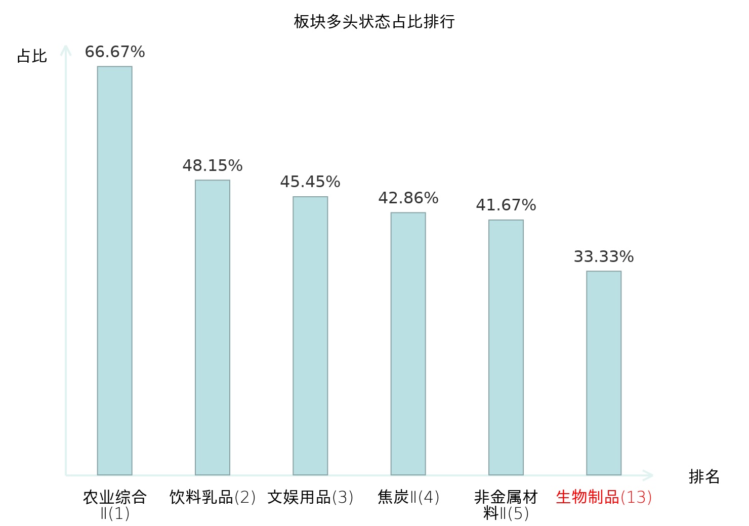 全市场所有行业板块中主力多头状态占比排名中,农业综合Ⅱ板块位居第一。特钢Ⅱ板块名次提升最快,较昨日上升46位。