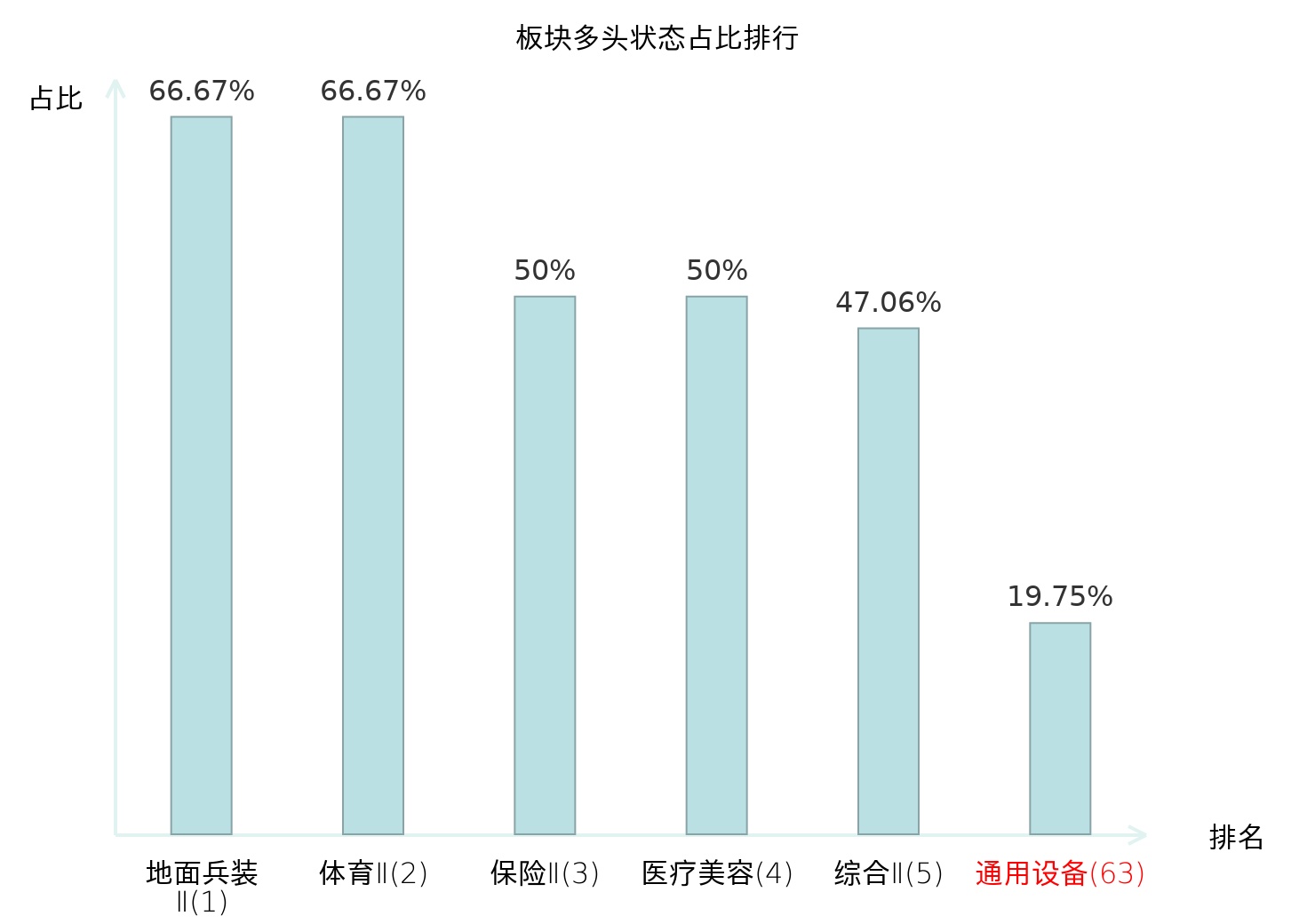 全市场所有行业板块中主力多头状态占比排名中,地面兵装Ⅱ板块位居第一。保险Ⅱ板块名次提升最快,较昨日上升82位。