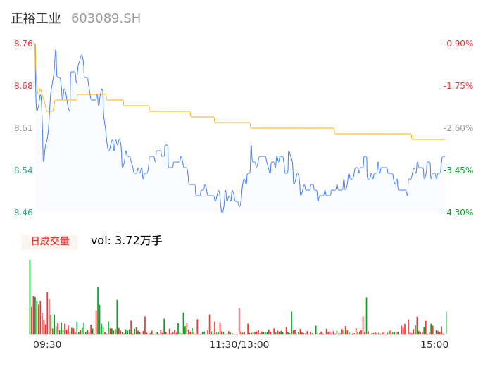 04月19日,正裕工业收报8.55,股价涨幅-3.28%,成交金额3198.21万元,换手率1.66%。