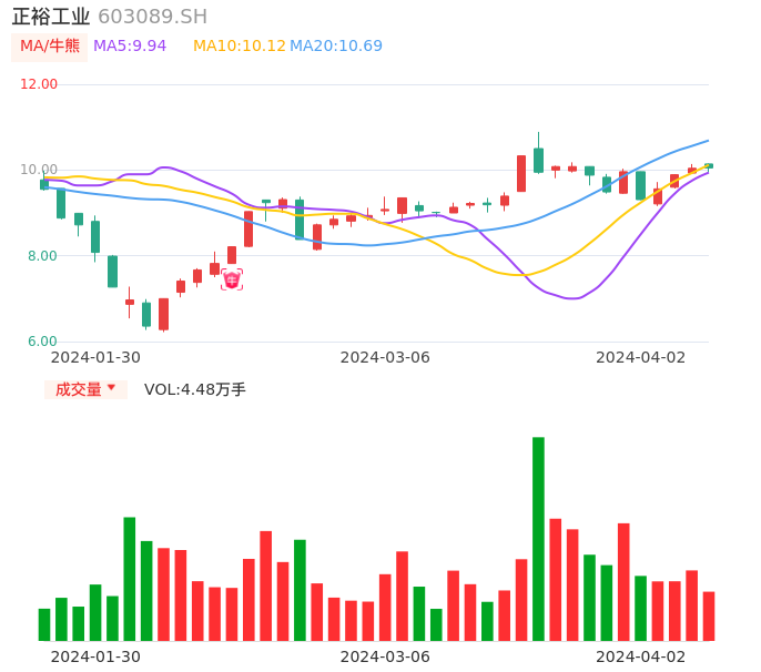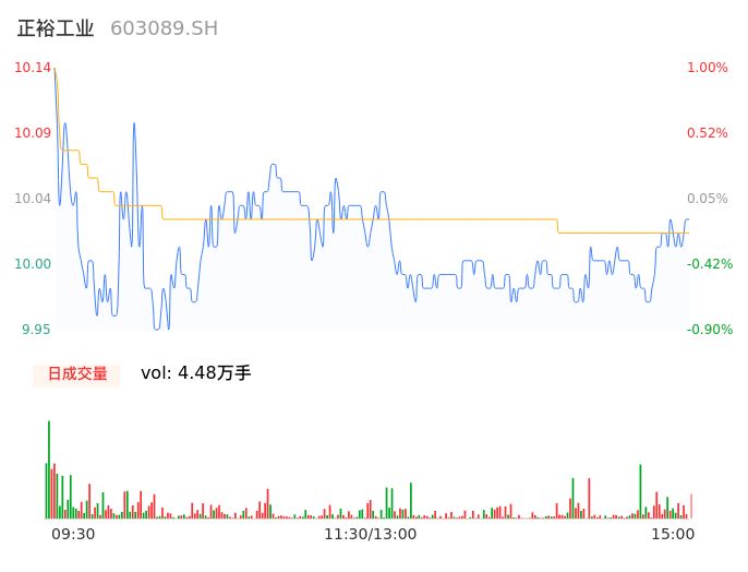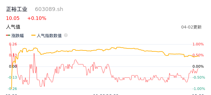 04月02日,正裕工业收报10.05,股价涨幅0.10%,成交金额4490.73万元,换手率2.00%。