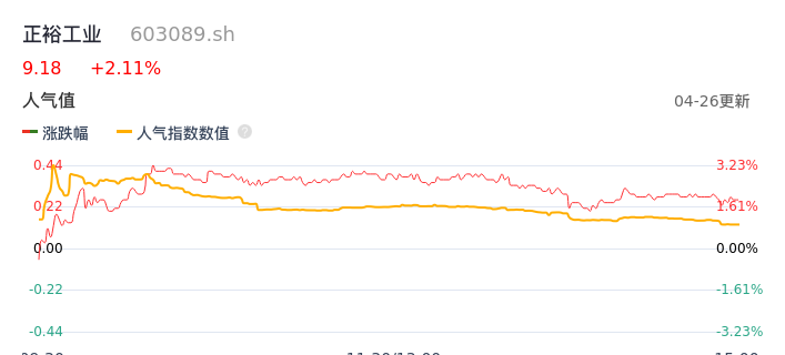04月26日,正裕工业收报9.18,股价涨幅2.11%,成交金额3365.29万元,换手率1.64%。