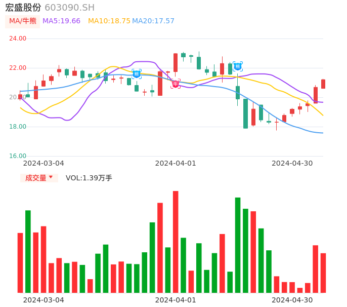 04月30日,宏盛股份收报21.20,股价涨幅2.51%,成交金额2917.21万元,换手率1.39%。