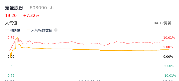 04月17日,宏盛股份收报19.20,股价涨幅7.32%,成交金额4303.46万元,换手率2.22%。