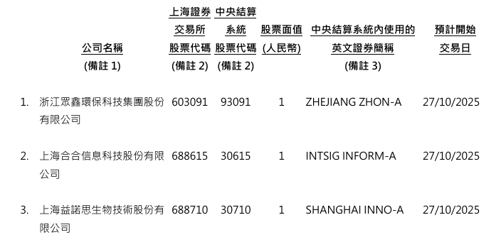 智通财经APP获悉,根据香港中央结算有限公司10月22日公告,众鑫股份(603091.SH)、合合信息(688615.SH)、益诺思(688710.SH)将于10月27日起在“沪港股票交易机制”(“沪港通”)下进行交易,并将会在同日被纳入成为中央结算系统合资格证券。该中华通证券的买卖会根据香港结算一般规则及香港结算运作程序规则在中央结算系统的持续净额交收制度下以人民币进行结算及交收。香港结算将不会就中华通证券提供实物股票记存及提取服务。