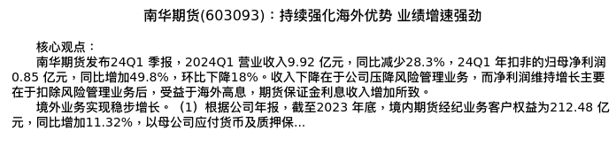 值得注意的是:2024年04月广发证券的陈福分析师,首次发布关于南华期货的研究报告,标题为:南华期货(603093):持续强化海外优势 业绩增速强劲。