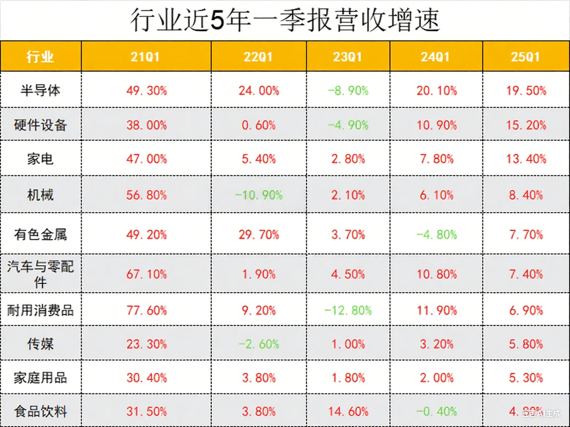 从行业的一季报来看,A股行业营收增速呈结构性分化:半导体、硬件设备等维持高增,国防军工、煤炭、纺织服装同比降幅超15%。历史对比显示,半导体连续两年增速超15%,家电、机械较2024年显著回升,国防军工、煤炭跌至近五年最低水平。