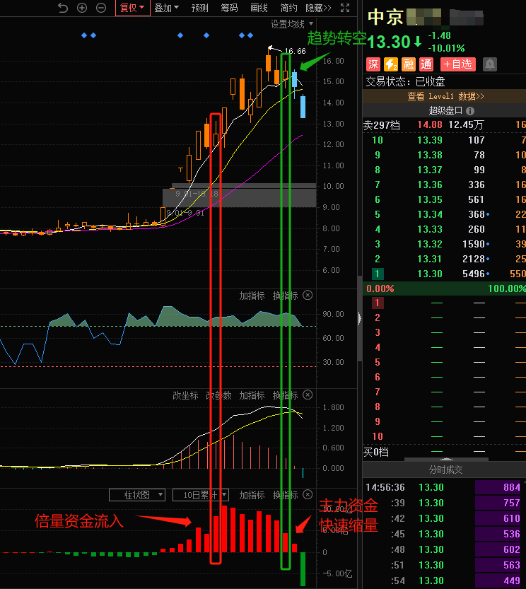 7月10日,该标的主力资金爆量流出,收盘价13.30元,跌停,部分资金卖不出去。