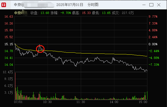 如果按照我们对强势股的止盈思路来看,7月1日,股价跌破昨收价,站不稳均价线在均价线处止盈大概14.90元,