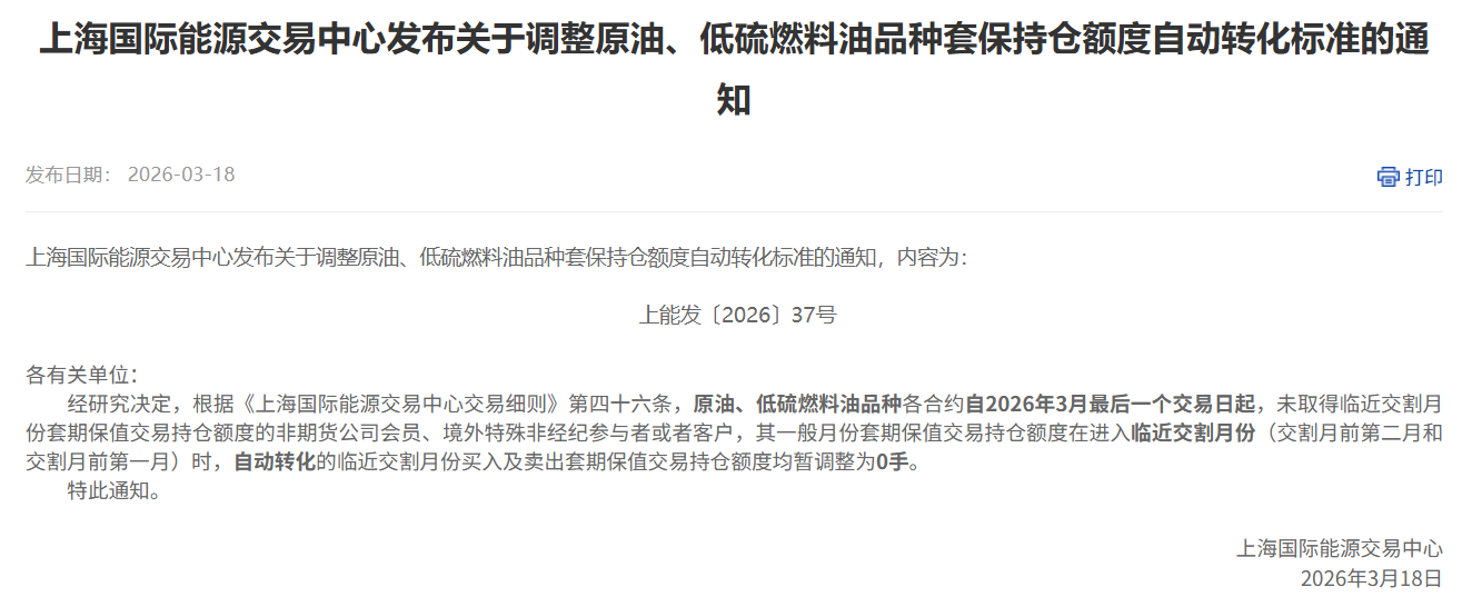 根据通知,原油、燃料油、低硫燃料油品种各合约自2026年3月最后一个交易日起,未取得临近交割月份套期保值交易持仓额度的非期货公司会员、境外特殊非经纪参与者或者客户,其一般月份套期保值交易持仓额度在进入临近交割月份(交割月前第二月和交割月前第一月)时,自动转化的临近交割月份买入及卖出套期保值交易持仓额度均暂调整为0手。