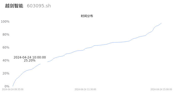 603095越剑智能2024年04月24日成交1.49万手,成交金额2219.69万元,相较昨日缩量4749手,换手率0.80%,成交清淡。