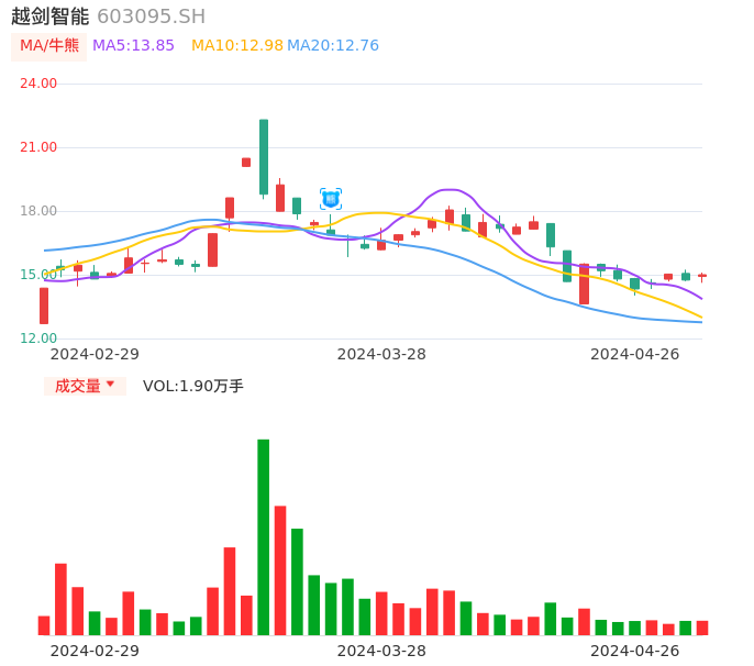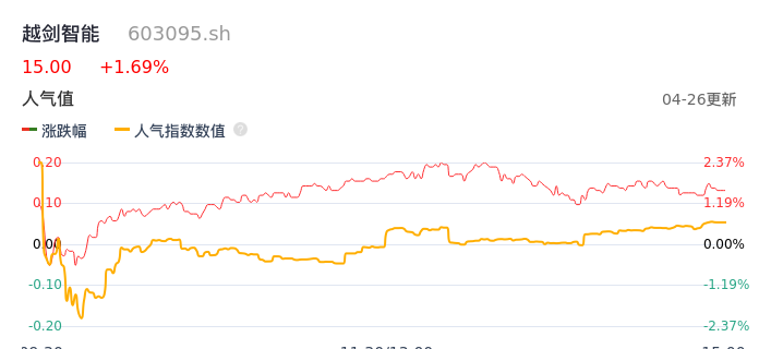 04月26日,越剑智能收报15.00,股价涨幅1.69%,成交金额2835.33万元,换手率1.03%。