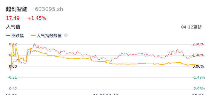 04月12日,越剑智能收报17.49,股价涨幅1.45%,成交金额4233.81万元,换手率1.31%。