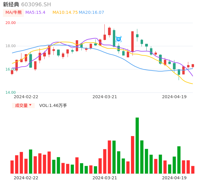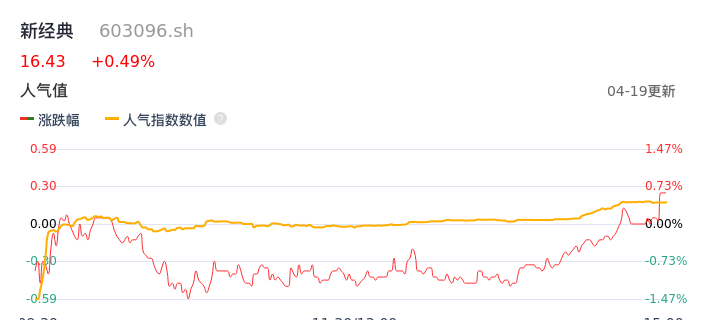 04月19日,新经典收报16.43,股价涨幅0.49%,成交金额2375.11万元,换手率0.90%。