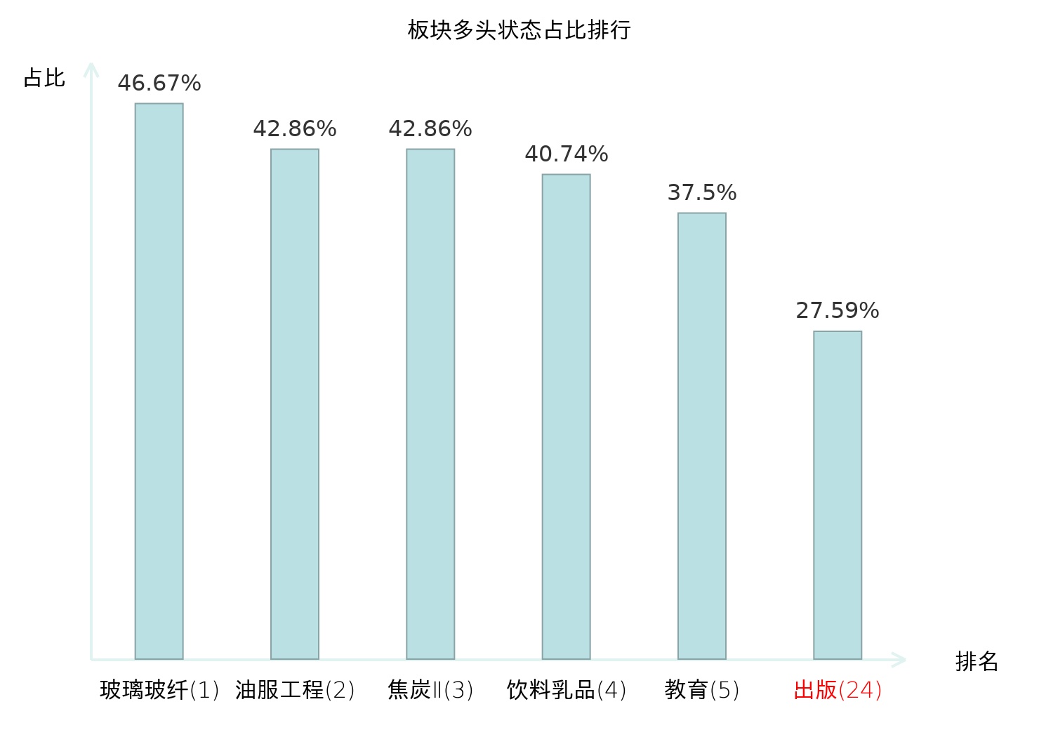 全市场所有行业板块中主力多头状态占比排名中,玻璃玻纤板块位居第一。航空机场板块名次提升最快,较昨日上升43位。