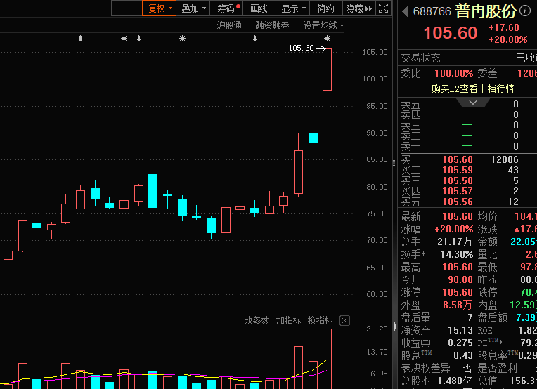 在此利好消息影响下,普冉股份9月16日高开高走。截至收盘,该股报105.6元,实现“20cm”涨停,市值超156亿元。
