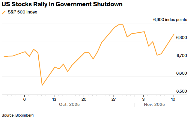 政府停摆五周,股市并非没有波动。在总统特朗普煽动与中国的贸易紧张局势后,截至10月10日的一周,标普500指数暴跌2.4%。