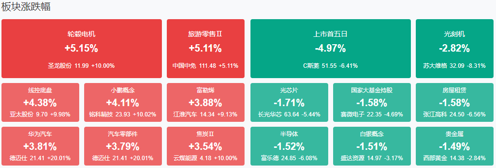板块方面,华为汽车、一体化压铸、旅游、智能驾驶等板块涨幅居前,光刻机、贵金属、福建自贸区、半导体等板块跌幅居前。