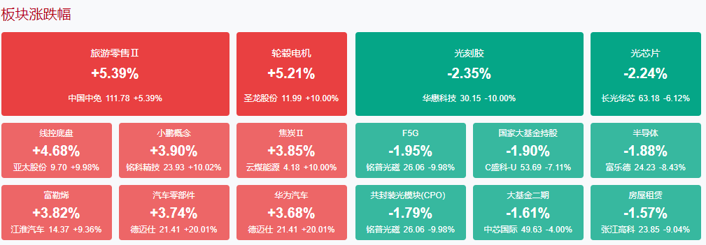 盘面上,汽车产业链个股集体走强,华为汽车概念股领涨,德迈仕、京泉华、赛力斯、华阳集团等十余股涨停。旅游股开盘拉升,长白山涨停。国货概念消费股午后活跃,美容、服装股等方向领涨,拉芳家化、美邦服饰、龙头股份等涨停。煤炭股一度冲高,云煤能源、安泰集团涨停。下跌方面,光刻机概念股集体调整,京华激光跌停,张江高科盘中触及跌停。板块方面,华为汽车、一体化压铸、旅游酒店、美容护理等板块涨幅居前,光刻机、CPO、超导概念、Chiplet等板块跌幅居前。