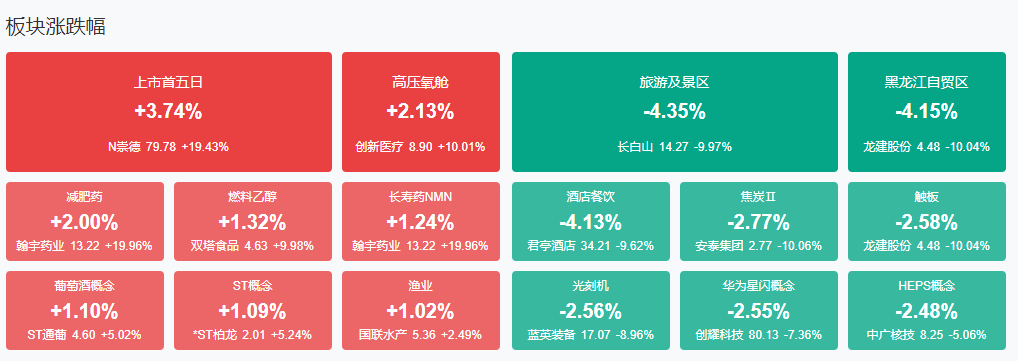 盘面上,ST板块继续逆势活跃,ST恒久、ST工智、*ST西发等近20只个股涨停。算力概念股开盘冲高,南凌科技涨近10%,拓维信息、剑桥科技一度涨停。机器人概念股盘中拉升,赛摩智能、中大力德、远东传动等涨停。减肥药概念股震荡走强,翰宇药业、德展健康涨停。下跌方面,旅游股集体调整,长白山跌停。板块方面,减肥药、ST板块、算力、银行等板块涨幅居前,酒店旅游、光刻机、星闪概念、公路铁路运输等板块跌幅居前。