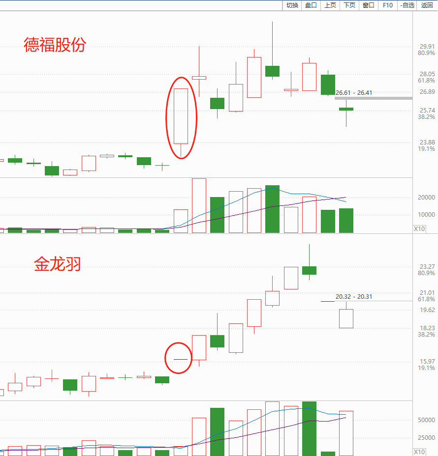比如近期走强的氢能源概念,1月5日板块第一次爆发,前排的德福股份和金龙羽同时涨停,德福股份小幅高开后迅速冲板,金龙羽一字,封板时间上后者明显占优。从最终走势上看,提前涨停的金龙羽,走出了一大波上升趋势,强度显然强于德福股份。