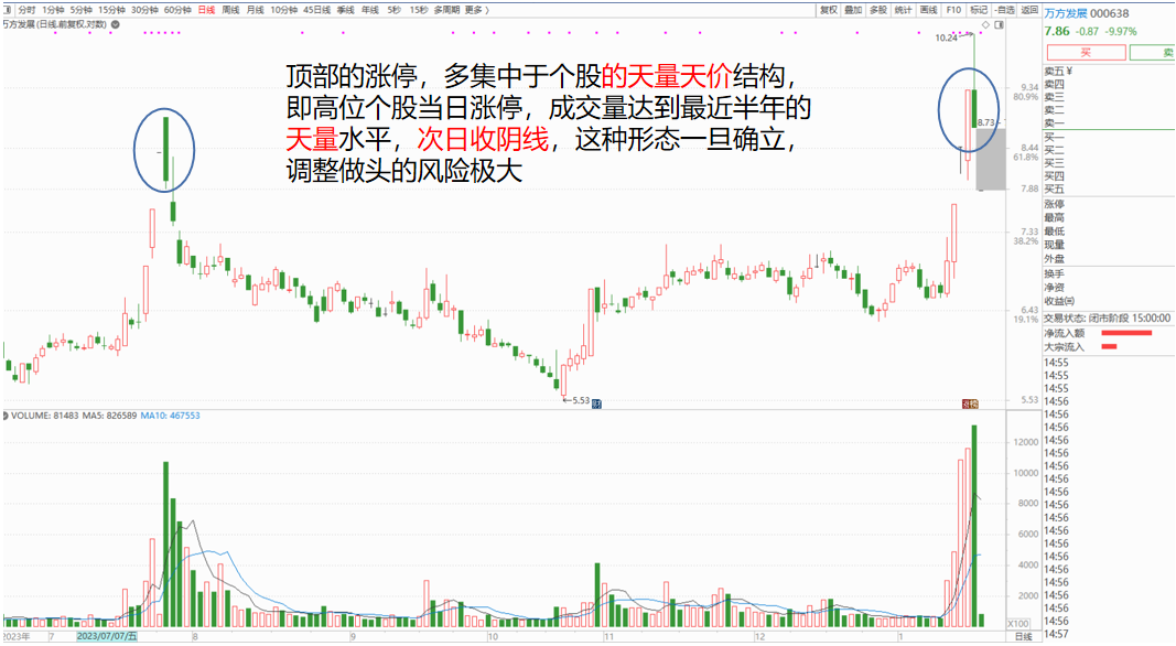 通常的判断方法是,结合天量天价的走势(此前和大家讲到过)去分析,下图万方发展的两个高点,比较容易说明问题。