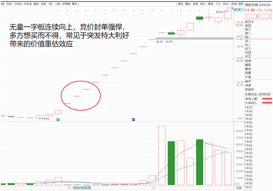 比如高新发展,该股最初几个交易日的连板期间,竞价挂单连续收出超越公司市值的买单,反映追买意识强烈,封单早、封单量大,为后续连板行情铺平道路。