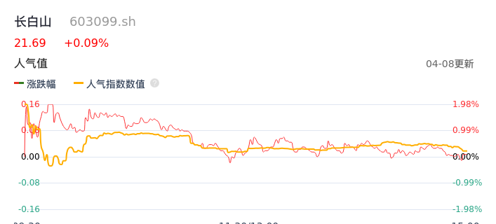 04月08日,长白山收报21.69,股价涨幅0.09%,成交金额2.08亿元,换手率3.57%。
