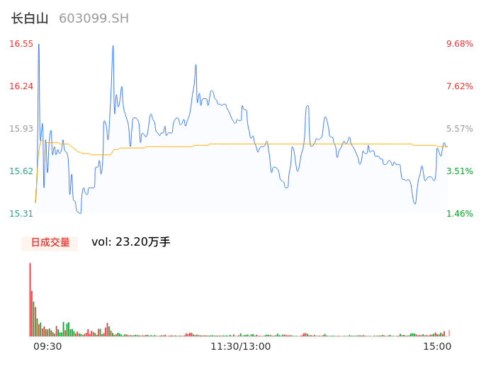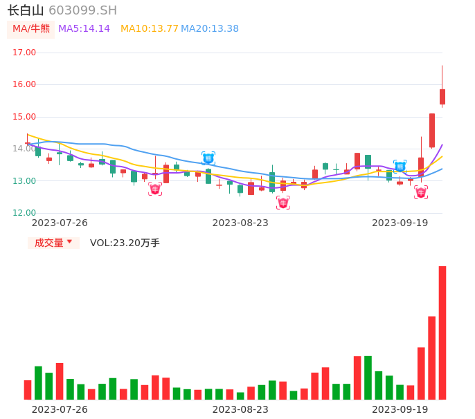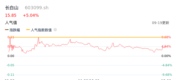 09月19日,长白山收报15.85,股价涨幅5.04%,成交金额3.67亿元,换手率8.70%。