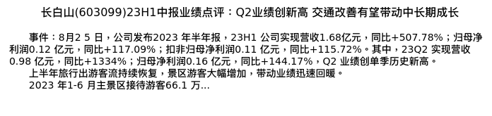 值得注意的是:2023年09月首创证券的于那分析师,首次发布关于长白山的研究报告,标题为:长白山(603099)23H1中报业绩点评:Q2业绩创新高 交通改善有望带动中长期成长。