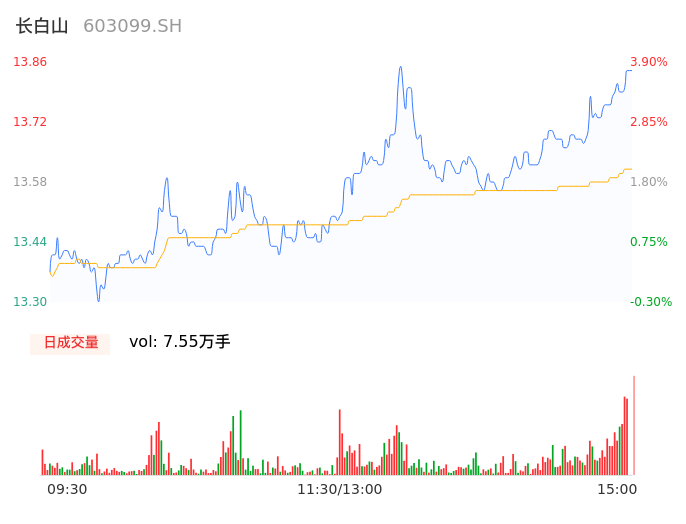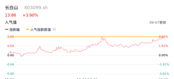 09月07日,长白山收报13.86,股价涨幅3.90%,成交金额1.03亿元,换手率2.83%。
