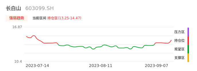 我们来看一下该股的九方特色指标强弱趋势的情况:长白山自09月01日从观望区上穿到持仓区。股价近期在多头区域持续强势上扬。上升动能仍较为充足,可积极持股。后续重点关注上方压力位:14.47元是否能突破上攻。