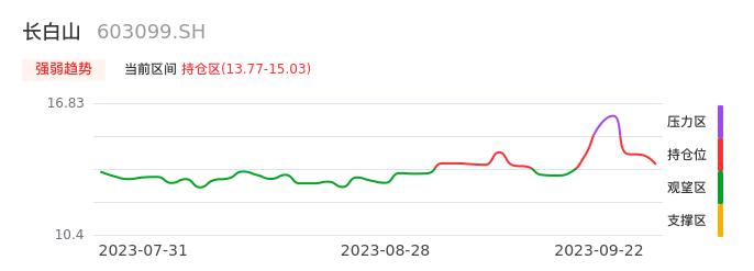 我们来看一下该股的九方特色指标强弱趋势的情况:长白山近日从压力区回到持仓区。股价快速拉升后出现持续调整。后续主要关注下方支撑位:13.77元是否能启稳回升。