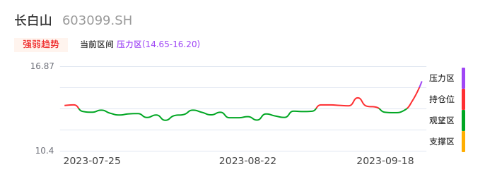 我们来看一下该股的九方特色指标强弱趋势的情况:长白山近日从持仓区进入压力区。股价出现一波快速拉升行情,目前上升动能较为充足可继续持股。注意今日上方压力位:16.20元是否能有效突破。