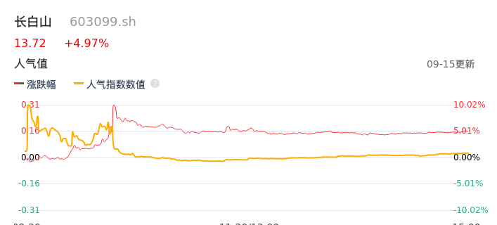 09月15日,长白山收报13.72,股价涨幅4.97%,成交金额1.25亿元,换手率3.41%。